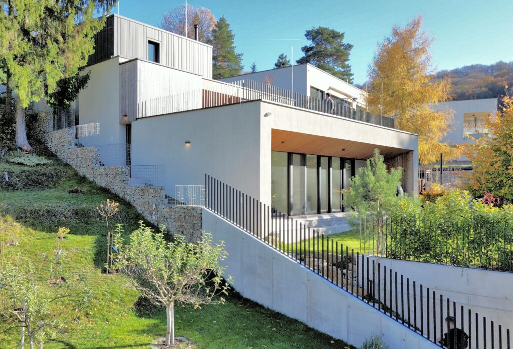 Rodinný dom na kaskáde CLT 24 v prudkom svahu Bratislavy bol náročnou výzvou. Kaskádový koncept domu bol v tomto prípade logickým riešením. Z vrchnej prístupovej komunikácie dom takmer nevidieť. Jeho kompaktná dvoj-garáž s kulisou zelených striech pôsobí nenápadne a príjemne. Naopak spodná typologicky poddimenzovaná príjazdová komunikácia obsahuje rozsiahle parkovacie plochy pod zelenou strechou, ktorá je zároveň pokračovaním záhrady. Denná časť domu s rozsiahlou terasou a zelenou strechou sa nachádza na strednom podlaží. Práve panoráma a ideálna poloha vstupu do domu zadefinovali polohu obytnej dennej časti. Nočná časť je umiestnená na najnižšom podlaží, ústiac terasou do záhrady. Celý koncept hmotovo-priestorového riešenia sa snažil minimalizovať potrebu oporných múrov na hranici pozemku, a zachovať tak charakteristiku susediacich pozemkov. Obytná hala s prevýšeným stropom a líniovým strešným svetlíkom poskytuje nádhernú hru svetla a tieňa ako aj príjemný pocit vzdušnosti. Konštrukčné riešenie je zaujímavou kombináciou CLT systému nadzemných častí a železobetónu v zakopaných častiach domu.